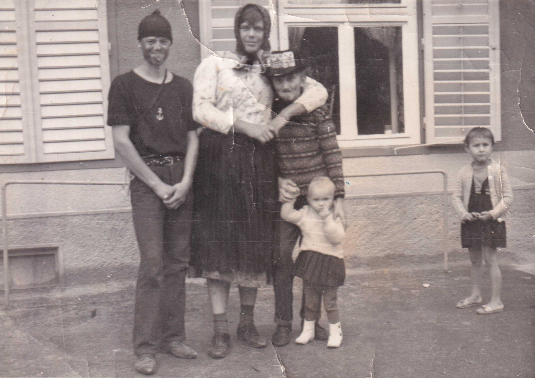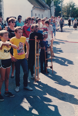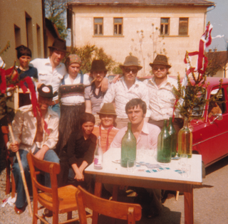 Am Bild sind Männer zu sehen, die "vorziehen". Ist der Bräutigam nicht aus Stinatz, so ziehen die jungen Männer der Ortschaft vor und verlangen Ablöse. Hier verlangen sie verkleidet als Frau mit Kind, Geld für ein angeblich uneheliches Kind des Bräutigams.