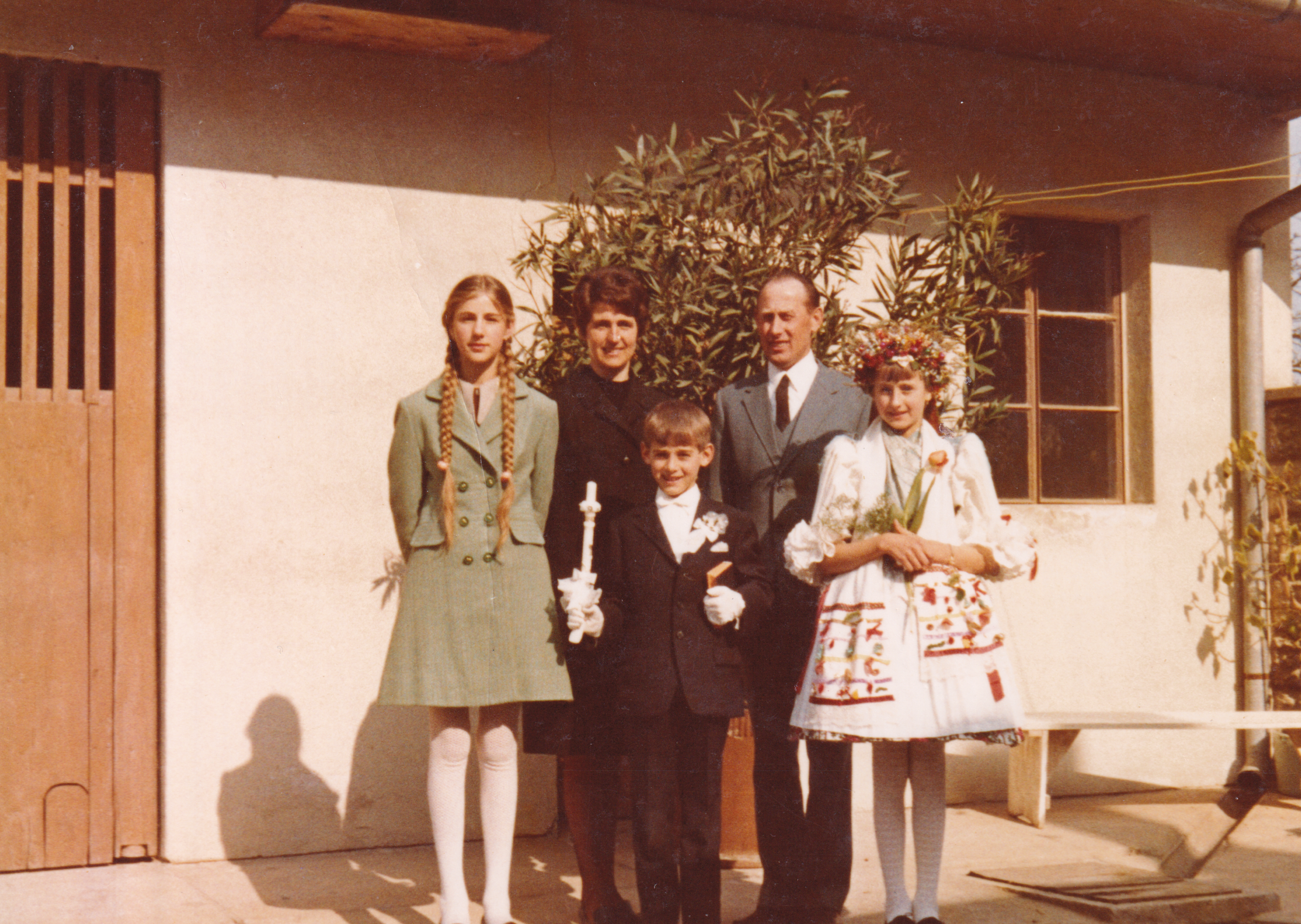 Prvopričesnik Pepi Zsivkovics sa svojom familijom u dvoru koncem 1960-ih ljet. Starja sestra Marija je obučena kot posnašnica.