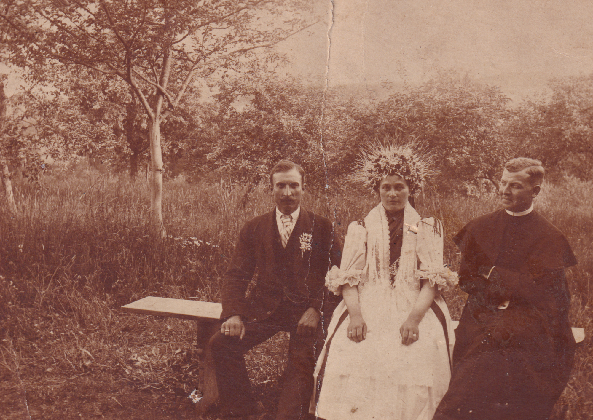 Das frisch vermählte Paar Theresia (Rezla Uzina) und Josef Porits mit dem Pfarrer Stefan Porits vermutlich am Tag ihrer Hochzeit am 21.05.1918 in Stinatz. Pfarrer Stefan Porits ist gleichzeitig auch der Bruder von Josef Porits aus Siegendorf und vermittelte die Ehe für seinen Bruder.