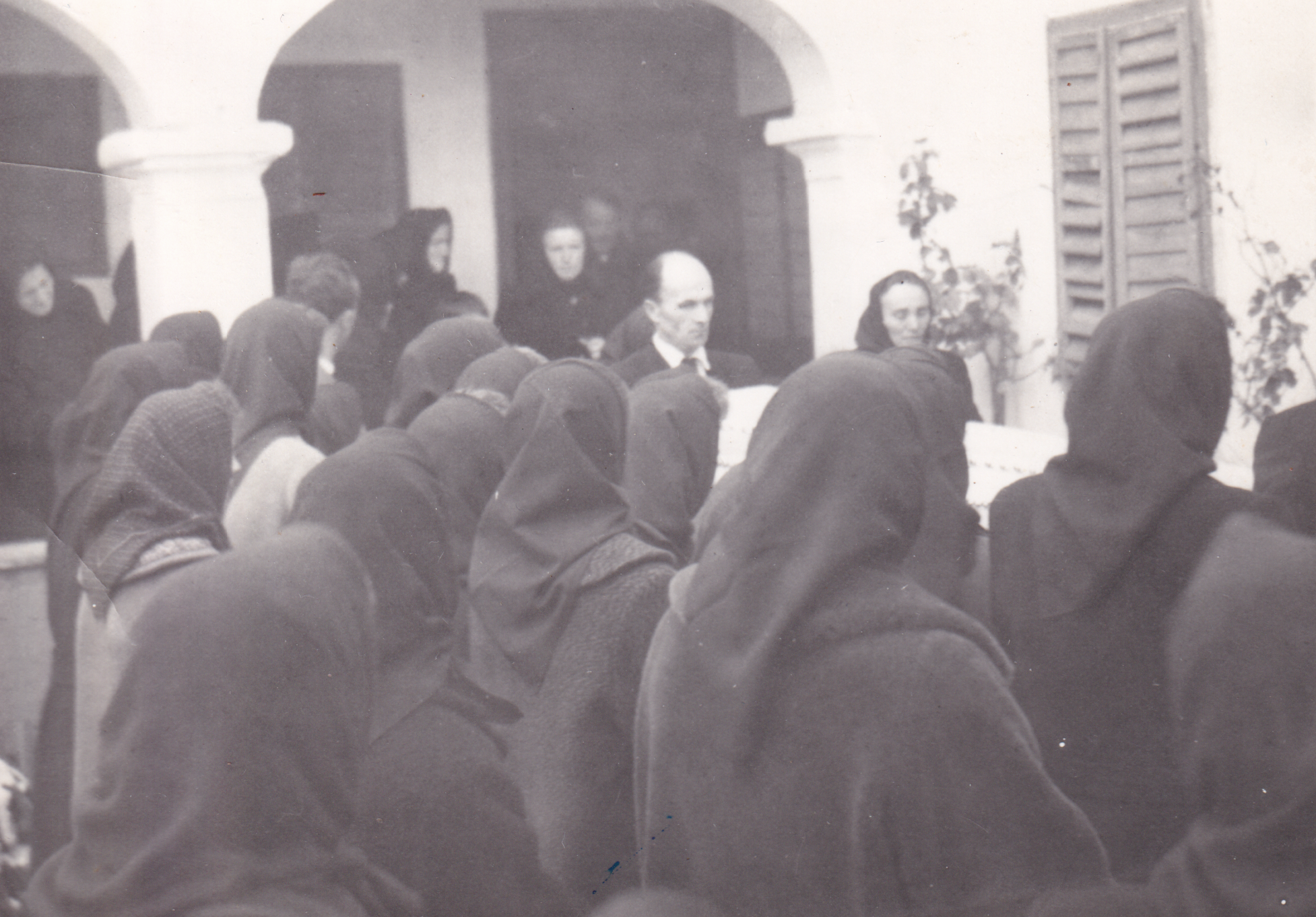 Der Sarg mit dem Leichnam von Maria Zsifkovits (Måre Oričkina) wird aus dem Hof getragen. Die Frauen mussten zu dieser Zeit schwarze Kopftücher tragen.