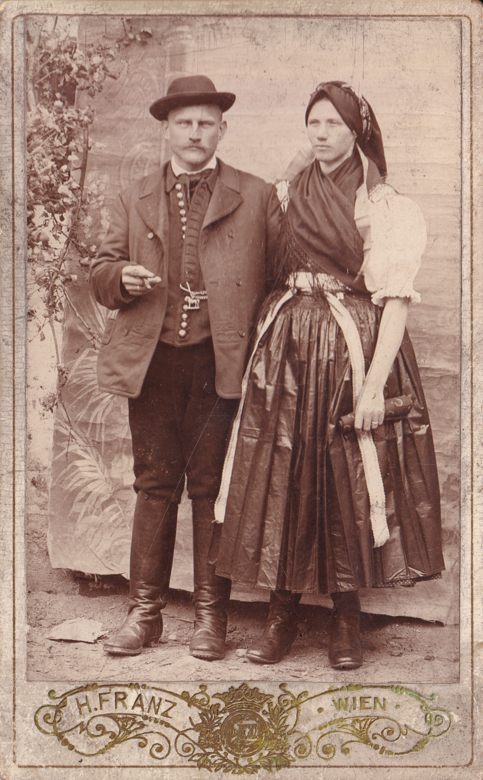 Souvenirfotografie aus Wien, die eine Frau in Stinatzer Tracht und einen Mann zeigt.