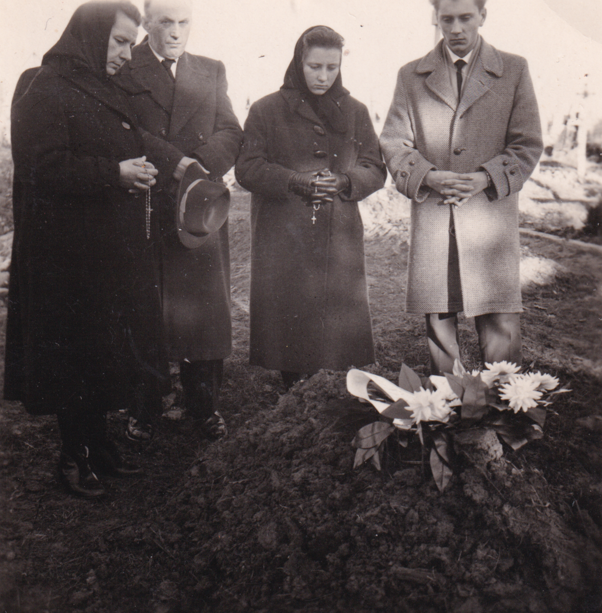 Agatha (Jagica Pafkina) und Johann Resetarits (Ive Uzin) mit Kindern Agathe (Aca Pafkina) und Rudolf (Rudi Pafkin) am Grab ihrer als Kleinkind verstorbenen Tochter Marica.