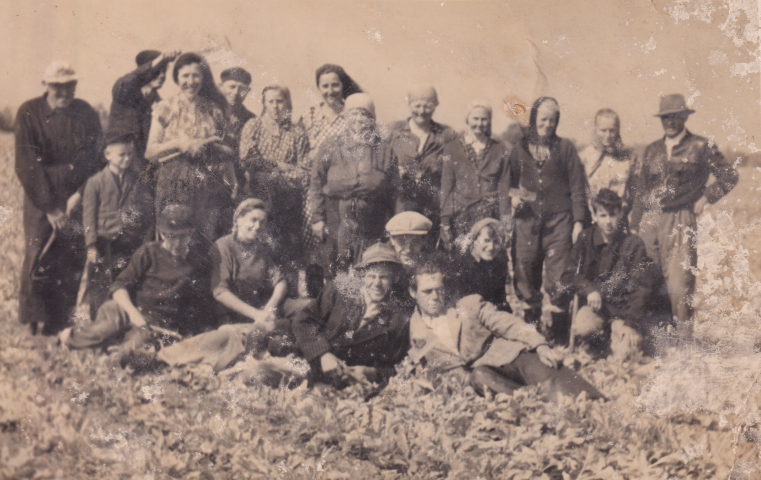 Stinatzer Frauen (und Männer) bei der Arbeit am Feld in der Fremde (vermutlich in Niederösterreich). In ihren Händen halten sie unterschiedliches Werkzeug für die Feldarbeit.