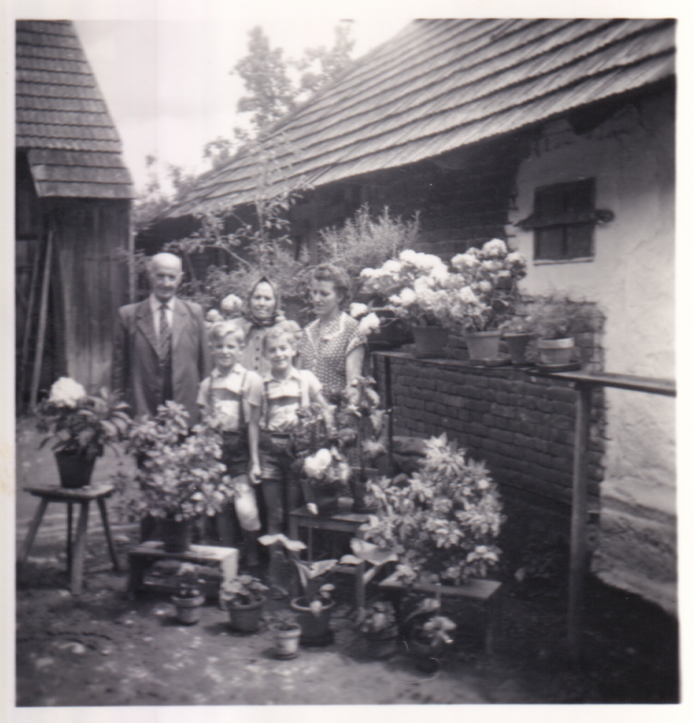 Familienfoto im Hof: Stefan und Angela Kirisits, Angela Resetarits, Erich und Wilhelm Resetarits.