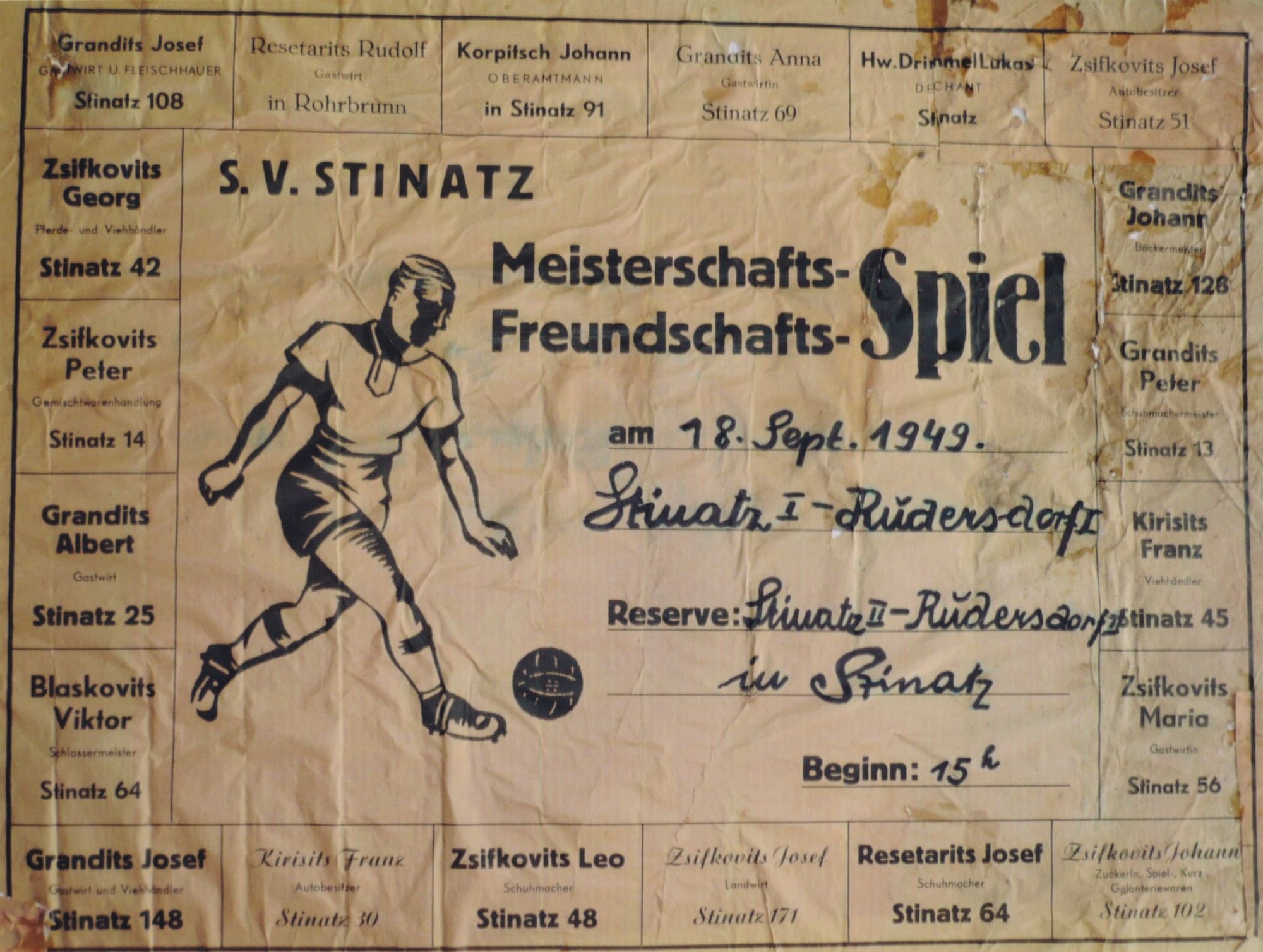 Plakat für das Fußballspiel Stinatz gegen Rudersdorf im Jahr 1949.