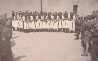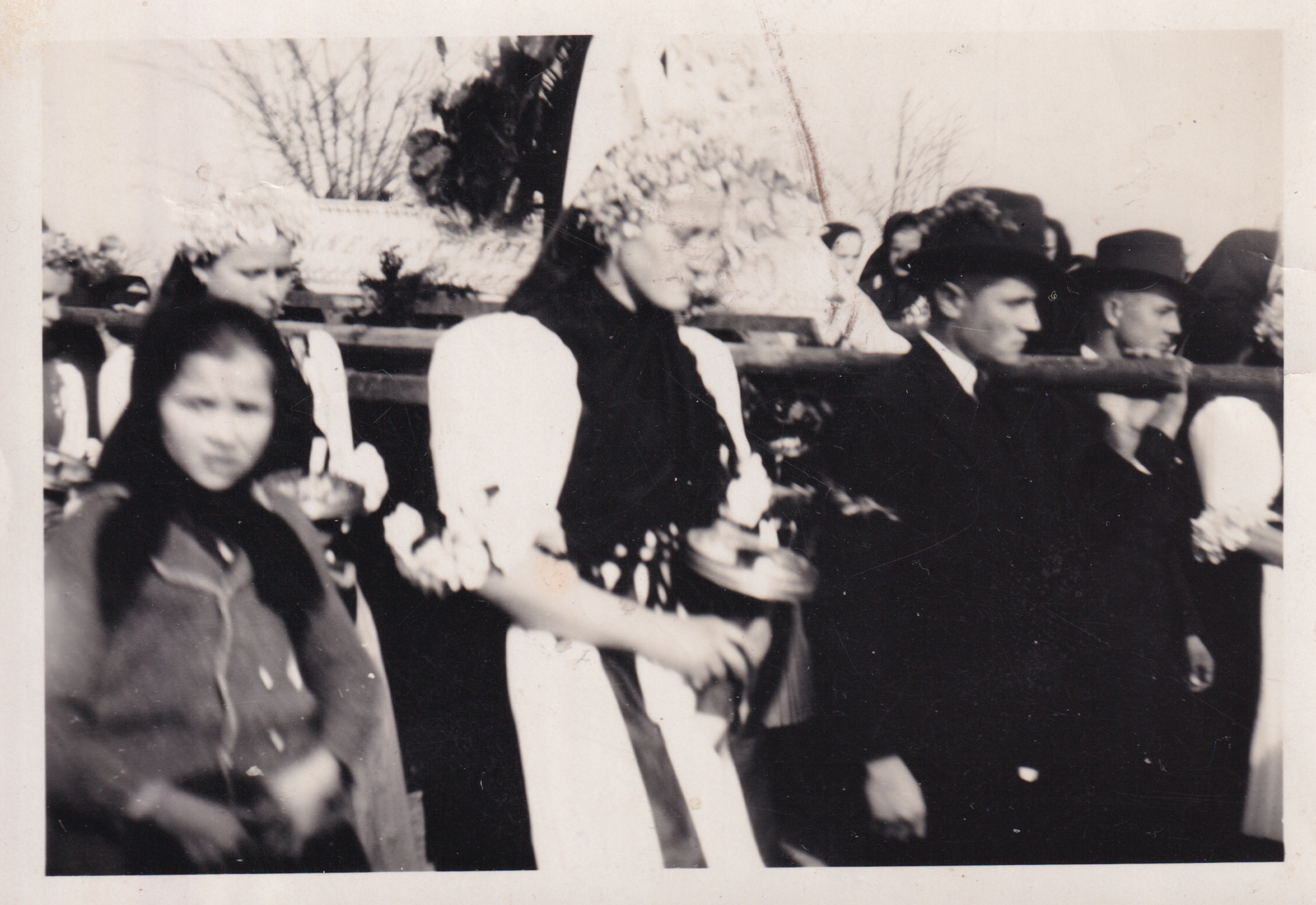 Begräbnis einer jungen Person im Jahr 1937. Das Mädchen links am Bild mit schwarzem Kopftuch ist Juditha Kirisits (Pafkina). Stirbt eine junge Person, so ziehen sich ihre Kolleginnen und Kollegen in Trauertracht bzw. ab den 1960er Jahren weiß an. In Stinatz wird das "razotkrit" genannt.