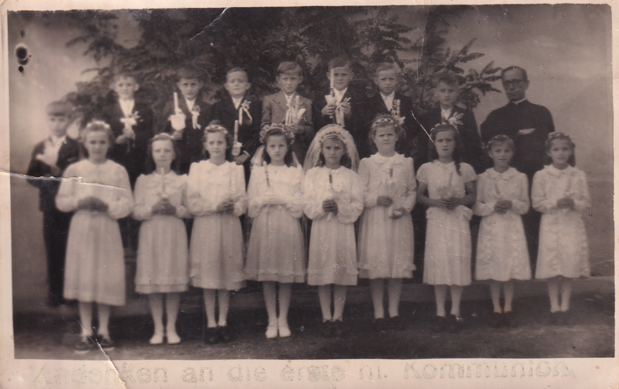 Erstkommunionsbild aus dem Jahr 1950. Zur Kommunion ging der Jahrgang 1940/1941. Pfarrer zu dieser Zeit war Luka Drimmel.