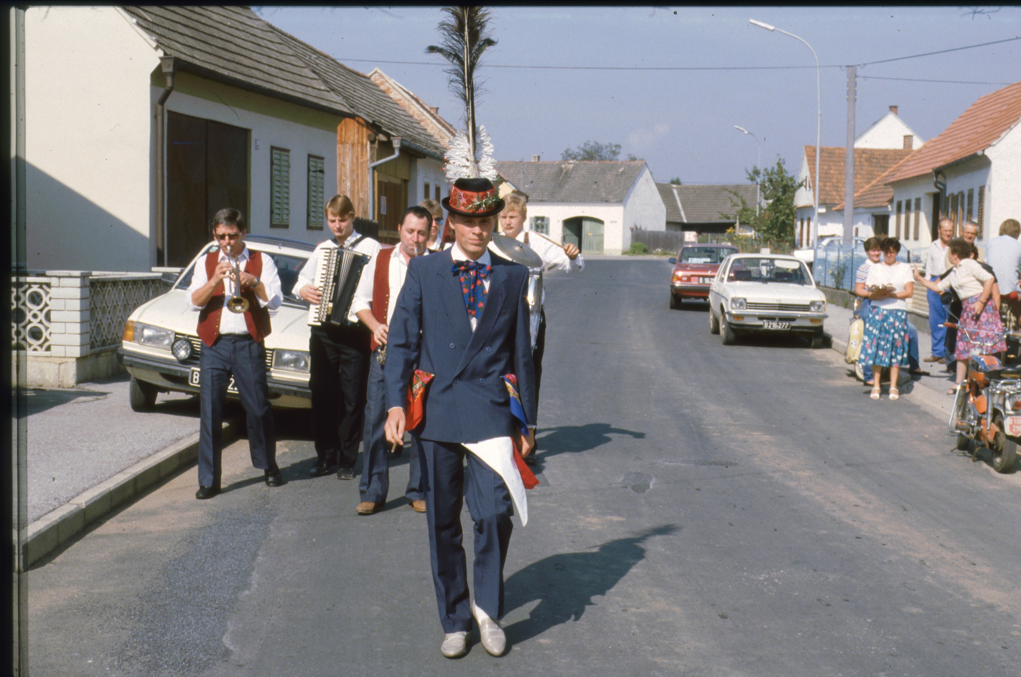 Der Kränzler Rudolf Kirisits und die Musikanten holen die Braut ab. Die Ortsbevölkerung betrachtet das Geschehen.