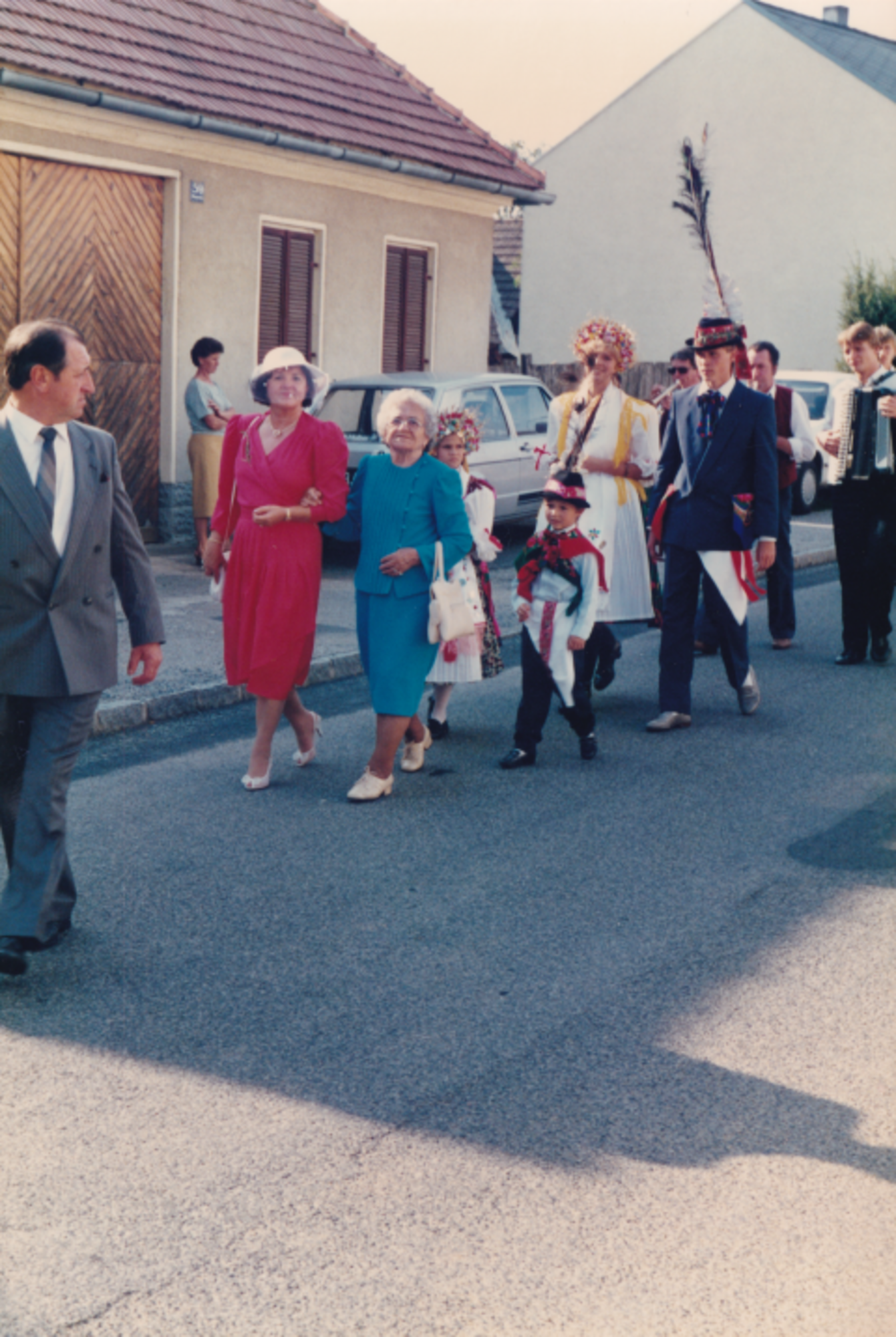 Der Hochzeitszug ist gut gelaunt und am Weg ins Gasthaus "Stinatzerhof". Am Bild sind die Tante und Großmutter des Hochzeitspaares zu sehen, wie auch die zwei Kränzlerpaare. Im Hintergrund sieht man die Musikanten.