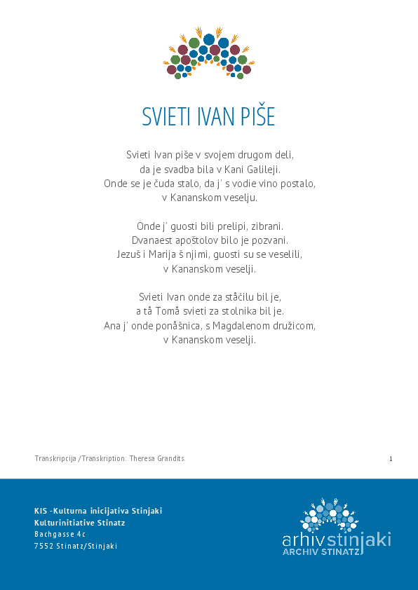 Das Lied über die Hochzeit zu Kanaa wird in Stinatz selten gesungen, gilt allerdings als ausgesprochenes Hochzeitslied. Das Lied ist im ganzen Burgenland bekannt, teilweise mit viel umfangreicherem Text. Im Phonogrammarchiv finden sich auch Aufzeichnungen aus Frankenau (B 623), Unterpullendorf (B 635) und Siegendorf (B 1395)