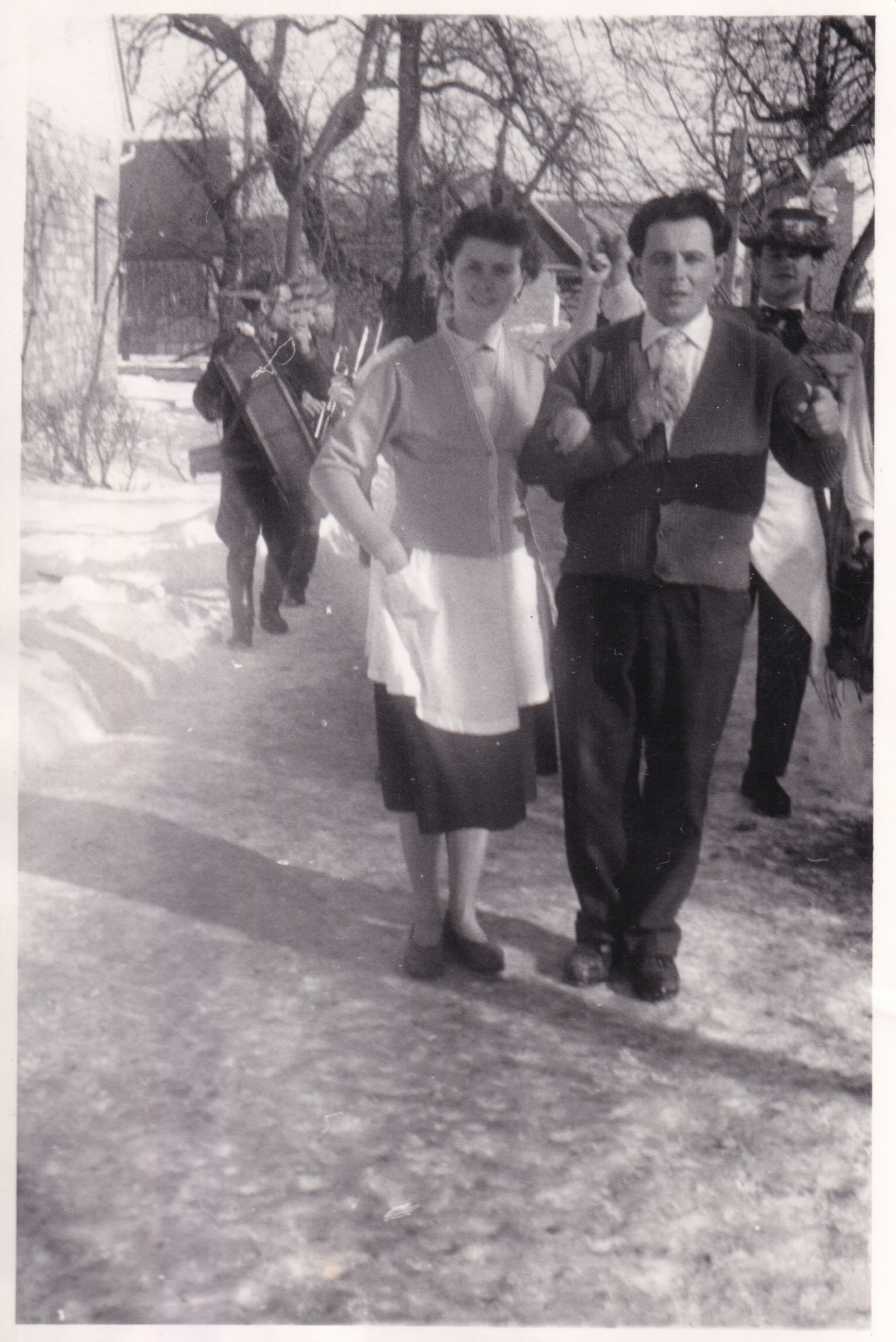 Am 27.01.1957 feierten Justina und Wilhelm Derkics ihre Hochzeit in Stinatz. Der Cousin der Braut mit seiner Partnerin beim Tanzen auf der vereisten Straße. Im Hintergrund sind der Kränzler und die Musikanten zu sehen.