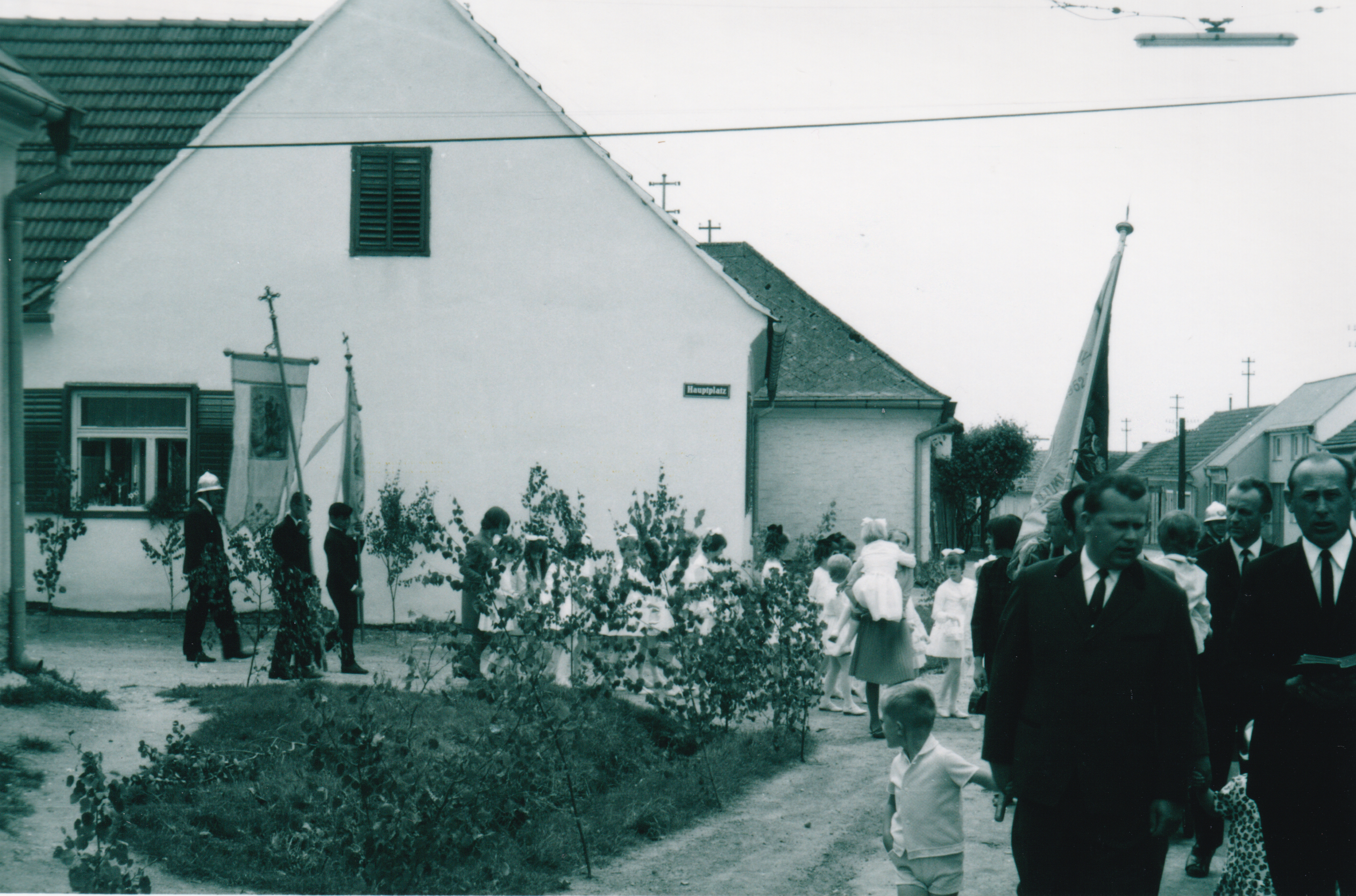 Prozession zu Fronleichnam 1968. Die Prozession befindet sich gerade auf der Höhe von Hauptstraße 102.