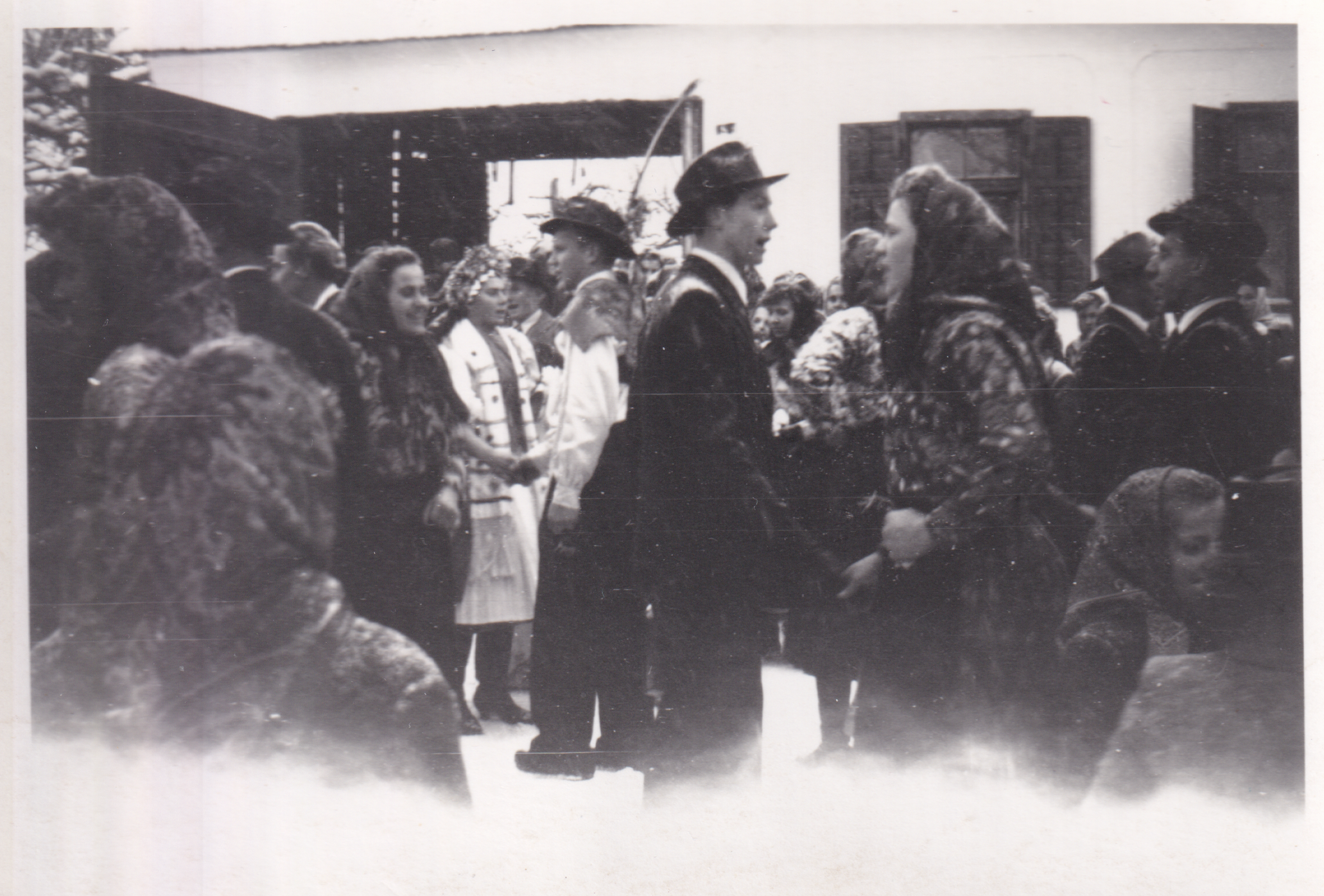 Staćilo, posnašnica i svatovi tancaju i jaču pred stanom, vjerojatno oko 1950. ljeta.