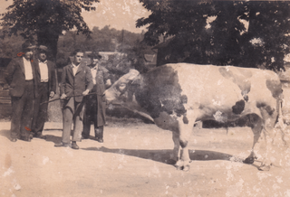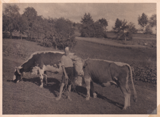 Maria und Andreas Sifkovits (Logoričini) vozu travu za blago iz polja domom. U kola su dvi krave upregnute.