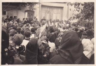 Mladi ljudi u nošnji tancaju na cesti kod vučenja hrasta 1950. ljeta. Odzada se vidi Logoričina hiža, danas glavna cesta 25.